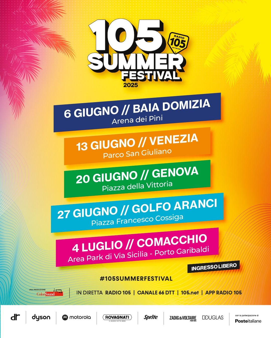 105 SUMMER FESTIVAL è sostenuto da DR Automobiles, Dyson, Motorola, Rovagnati, Sprite, Zadig & Voltaire Parfums – Douglas, con la partecipazione di Poste Italiane.