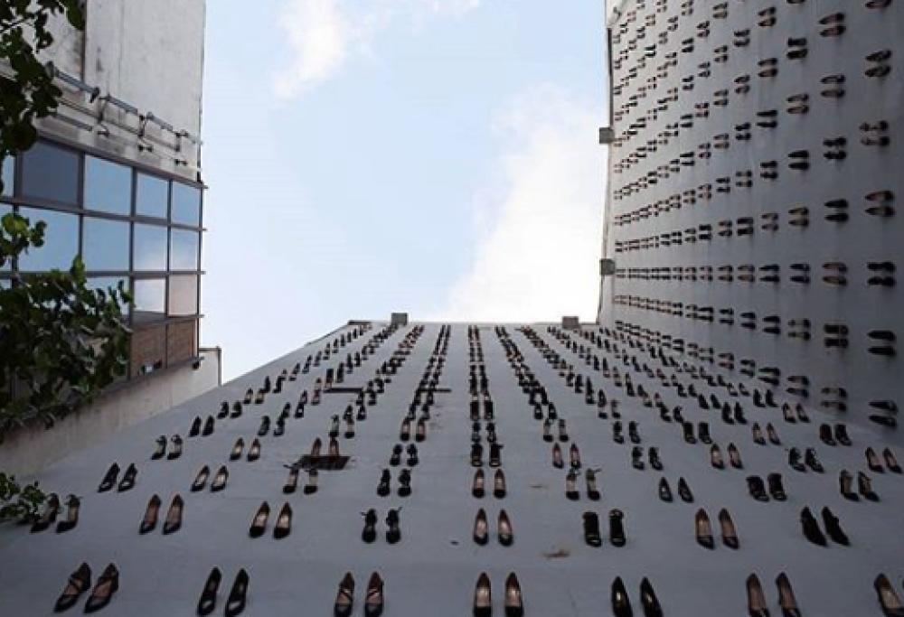 L’artista ha attaccato sulle pareti esterne di un edificio della città 440 paia di scarpe nere con tacchi alti: l’idea di utilizzare delle calzature per ricordare le donne uccise viene dalla traduzione turca, secondo la quale, quando muore qualcuno, i familiari mettono le scarpe fuori dalla porta di casa per indicare il lutto.