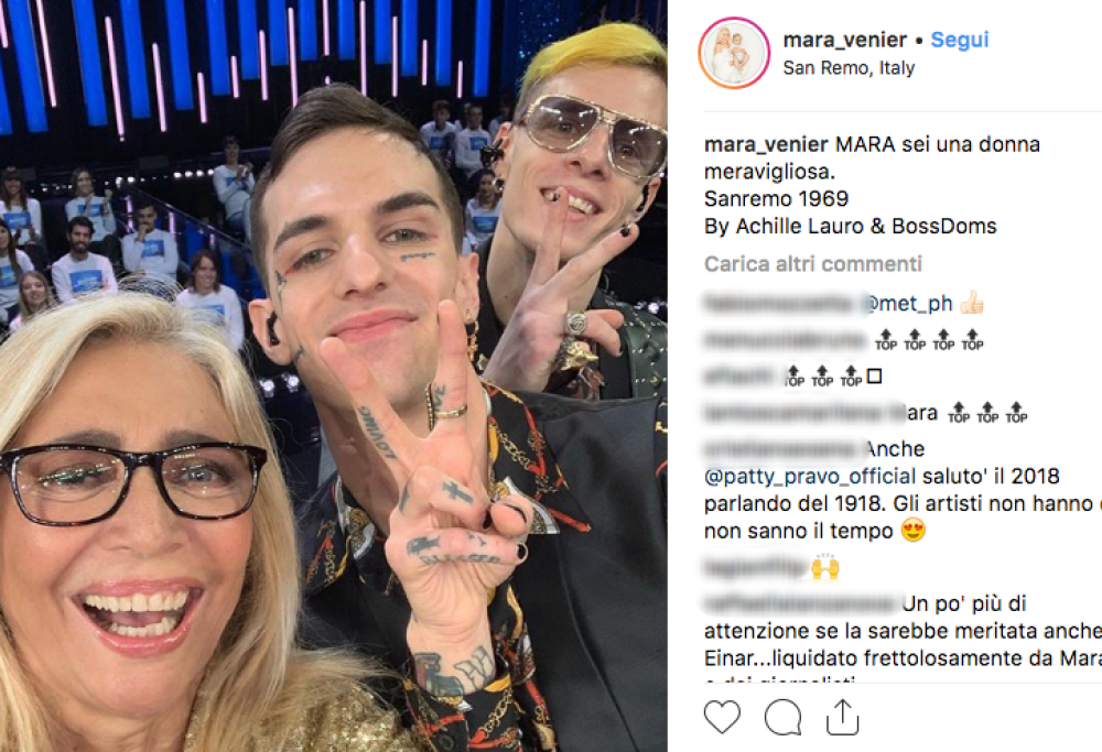 La Venier è rimasta molto colpita dalle parole del giovane, che quindi ha continuato a lusingarla: “Davvero Mara, per me è un onore essere con te”. Poi, al termine della sua esibizione, è stata la conduttrice a continuare il siparietto: “Ma ce l’hai la fidanzata?”, gli ha chiesto. Lui ha risposto di sì, che è fidanzato da tanto tempo: “Ce sto’ a provà – ha scherzato ancora Mara per poi concludere ridendo – macché, so vecia!”. A quel punto i due si sono fatti un selfie insieme, anche con Boss Doms: “Mara, sei una donna meravigliosa”, questa la dedica che Achille Lauro ha rivolto con questa foto alla sua nuova amica.