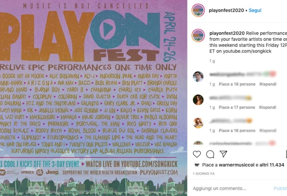 Più di 65 artisti internazionali per tre giorni di musica no stop. Si tratta di PlayOn Fest 2020, il primo festival virtuale, i cui proventi andranno in beneficenza per aiutare l’Organizzazione Mondiale della Salute nella lotta al Covid-19. Dal 24 al 26 aprile, a partire dalle ore 12, verranno riproposti online i concerti degli artisti che hanno aderito all’iniziativa.