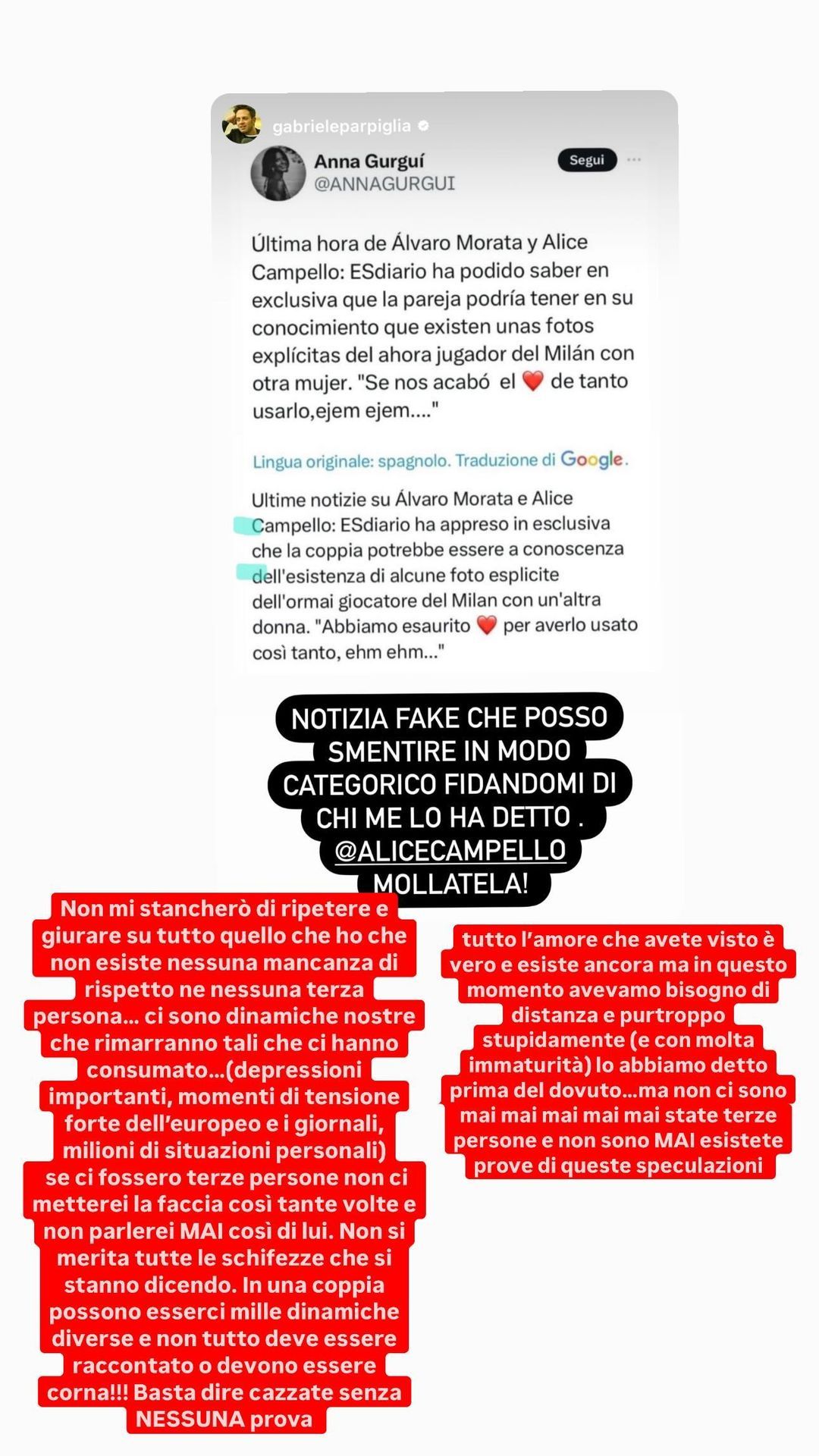 Alice ha poi sottolineato che Morata non merita le schifezze che si stanno dicendo sul suo conto: “In una coppia possono esserci mille dinamiche diverse e non tutto deve essere raccontato o devono essere corna. Basta dire cazz… senza nessuna prova. Tutto l’amore che avete visto è vero e esiste ancora ma in questo momento avevamo bisogno di distanza e purtroppo stupidamente (e con molta immaturità) lo abbiamo detto prima del dovuto. Ma non ci sono mai mai mai mai mai state terze persone e non sono mai esistite prove di queste speculazioni”.