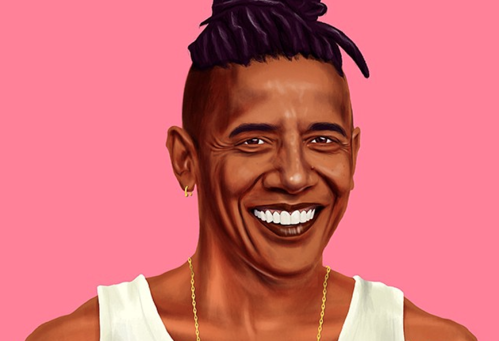 L’illustratore ha creato Hipstory, una serie di immagini in cui ha ripensato, alla luce dello stile e della moda hipster, personaggi e leader storici. Ecco che Barack Obama è pensato da Shimoni con lunghi capelli raccolti in chignon, tatuaggi sul corpo, catenina e orecchini d’oro e una canottiera.