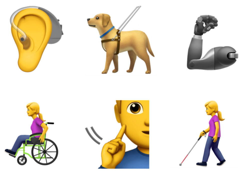 Le possibili nuove emoji sono 13: un uomo e una donna che camminano appoggiati al bastone, un cane guida, un cane da assistenza, un uomo e una donna su una sedia a rotelle elettrica o meccanica o non udenti. Inoltre hanno pensato anche a emoji di: protesi di un braccio e di una gamba e un orecchio con un impianto acustico.