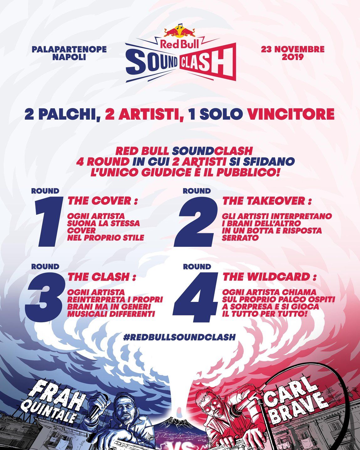 Arriva per la prima volta in Italia Red Bull SoundClash, uno dei più divertenti format musicali che vedrà protagonisti Carl Brave e Frah Quintale in una competizione amichevole a colpi di musica sabato 23 novembre al Palapartenope di Napoli.