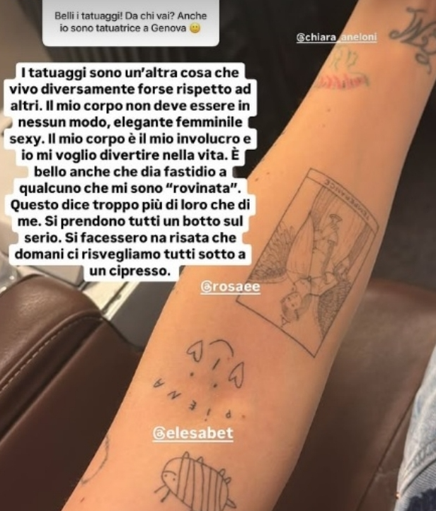 “I tatuaggi sono un’altra cosa che vivo diversamente forse rispetto ad altri. Il mio corpo non deve essere in nessun modo elegante, femminile, sexy. Il mio corpo è il mio involucro e io mi voglio divertire nella vita”, ha spiegato Aurora, ribadendo quanto per lei sia importante la libertà di espressione.
