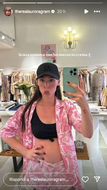 In un selfie allo specchio scattato all’interno di un negozio, Aurora indossa un bikini nero e un cappellino abbinato, completati da una camicia e shorts a righe rosa e bianche. Perplessa dispiaciuta, scrive nella didascalia: “Scusa mamma, non ho messo la crema”, accompagnando il messaggio con una faccina triste. Il decolleté di Aurora mostra infatti un contrasto tra il rosa naturale della pelle e il rosso acceso della scottatura.