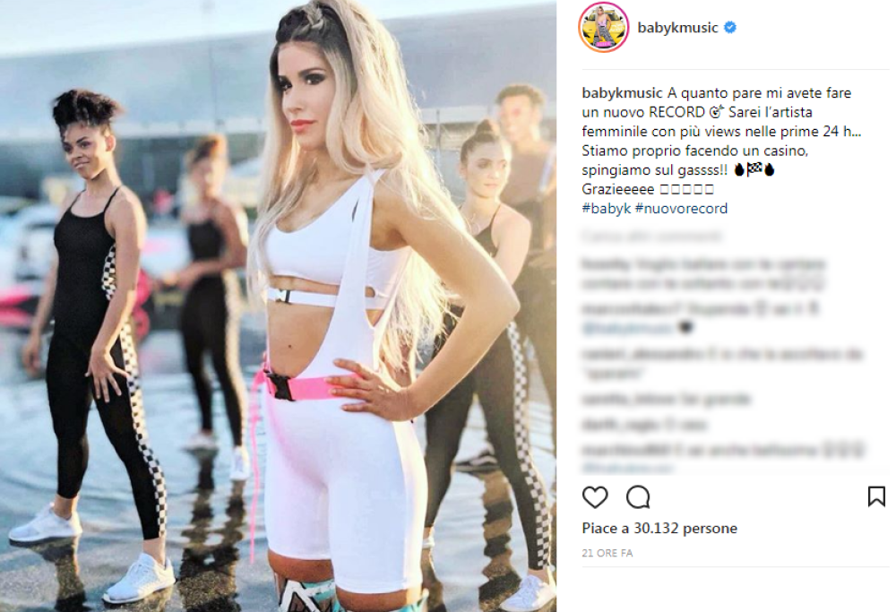Non si sa ancora se Da zero a cento ripeterà il successo di Roma-Bangkok e Voglio Ballare Con Te, ma l’ultimo singolo di Baby K ha già messo a segno un record importante. Il videoclip della canzone, come ha riportato la stessa cantante sul suo profilo Instgram, l’ha infatti resa l’artista femminile con più views a 24 ore dalla pubblicazione. “Stiamo proprio facendo un casino, spingiamo sul gassss!!” ha scritto Baby K ringraziando i suoi fan.