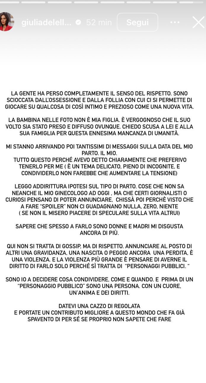 Giulia ha concluso con un messaggio diretto, distinguendo il gossip dalla violenza: “Qui non si tratta di gossip ma di rispetto. Annunciare al posto di altri una gravidanza, una nascita o peggio una perdita è una violenza. E la violenza più grande è pensare di avere il diritto di farlo solo perché si tratta di ‘personaggi pubblici’. Datevi una ca**o di regolata”.