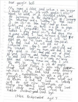 A volte i sogni possono diventare realtà. Chloe è una bambina di 7 anni che viene da Hereford, un piccolo paese nel sud dell’Inghilterra, e da grande vorrebbe tanto lavorare per Google, a tal punto che, impugnata una penna e un foglio di carta, ha scritto una lettera a mano al numero uno di Google per svelargli le sue intenzioni: “Caro boss di Google, mi chiamo Chloe e quando sarò grande voglio lavorare per voi – scrive la bambina – , ma vorrei anche lavorare in una fabbrica di cioccolato e nuotare alle olimpiadi. […] Mi piacciono i computer e possiedo un tablet su cui gioco. Papà sostiene che mi sarebbe molto utile imparare ad utilizzare bene il computer. […] La mia maestra ha detto a mamma e a papà che sono molto capace e mi comporto bene. Papà mi ha anche detto che, se continuerò ad imparare con questo impegno, un giorno potrò venire a lavorare a Google” dice la bambina. È stato proprio il padre di Chloe che, vista l’insistenza della bambina, le ha suggerito di scrivere una lettera a Google.