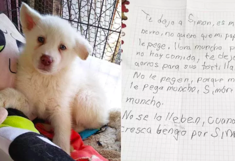È stato abbandonato con una lettera bellissima. Simon, un cagnolino di Città del Messico, tutto bianco con due occhioni meravigliosi, è stato ritrovato presso l’Albergue Pergatuzoo, un rifugio del posto. A lasciarlo il suo padroncino, che non poteva più occuparsi di lui. Ecco quello che c’era scritto nel messaggio scritto a mani: “Ti lascio Simon. Lui è il mio cane. Non voglio che mio padre lo colpisca. Piange molto perché non c’è cibo. Vi lascio i miei risparmi per le sue tortillas. Non colpirlo perché mio padre lo colpisce molto. Simon mangia molto. Non portarlo via. Quando sarò grande tornerò per Simon“.