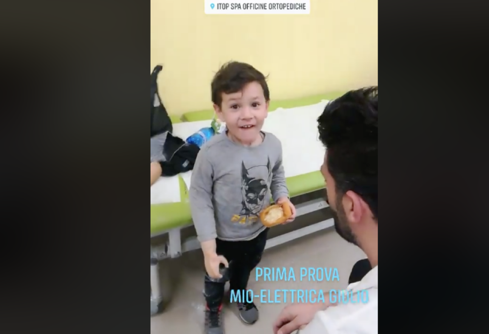 Giulio ha 3 anni, è di Roma ed è nato senza un braccio. Grazie alla tenacia della famiglia e alla sua grande determinazione, il bambino ha provato per la prima volta una protesi grazie alla quale, non solo ha un braccio, ma riesce anche a muovere la mano.