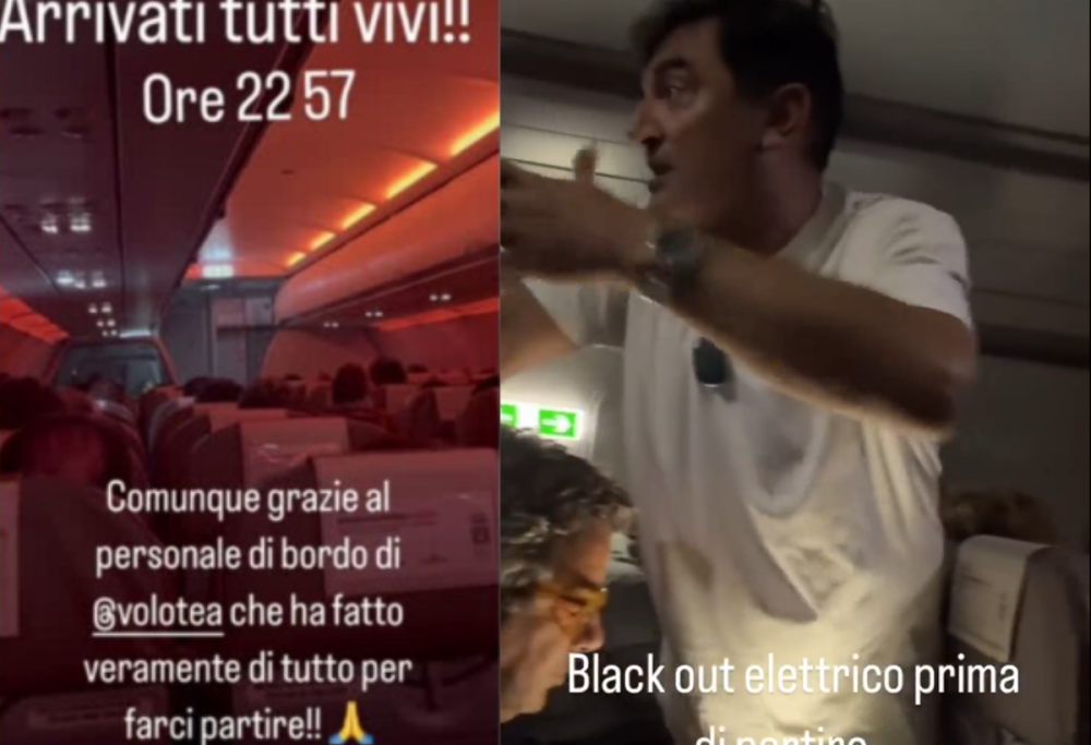 Max Giusti calma i passeggeri durante un blackout pre-decollo: «Stiamo calmi o ci facciamo male». La disavventura raccontata sui social