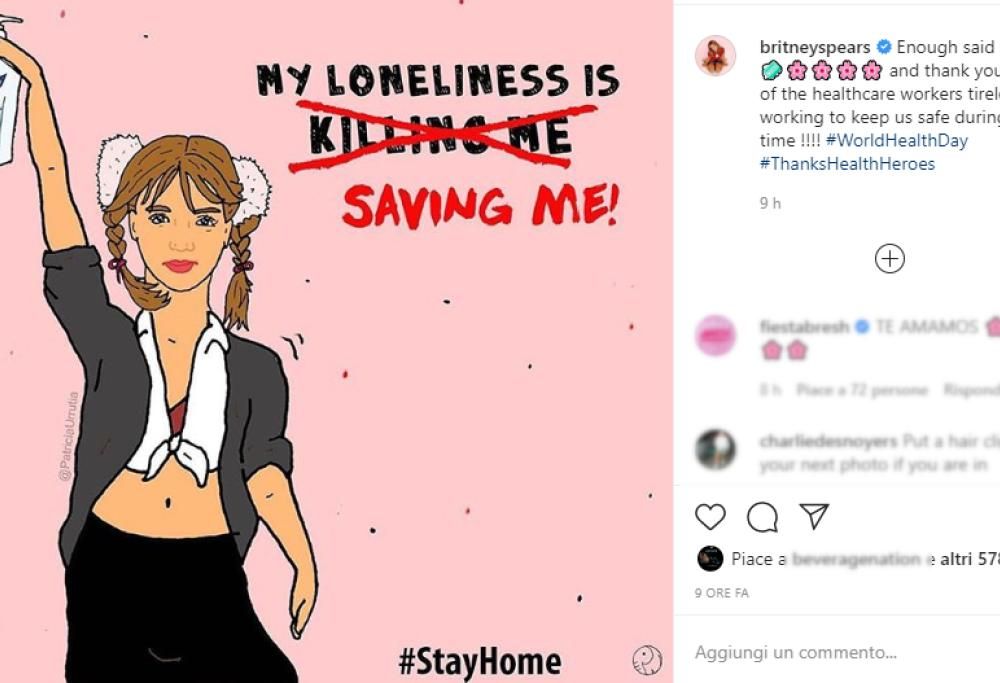 Poche ore fa sul profilo Instagram della popstar è infatti comparso un nuovo post: nella foto c’è un’illustrazione di Britney (realizzata dall’illustratrice Patricia Urrutia) in cui la cantante regge una bottiglia di disinfettante per le mani e accanto a lei si legge una frase modificata del brano “… Baby One More Time”. Il testo, infatti, recita “la mia solitudine mi sta salvando”, invece del testo originale della canzone, “la mia solitudine mi sta uccidendo“.