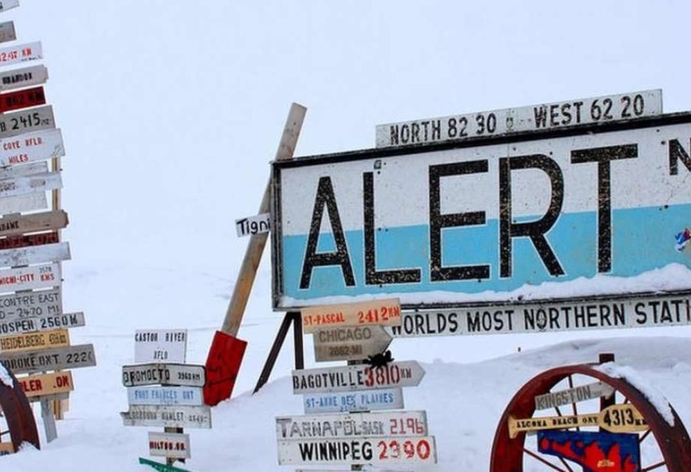 Il centro di Alert, situato nel territorio di Nunavut in Canada, ad una distanza di soli 817 km dal Polo Nord, è l’insediamento permanentemente abitato tutto l’anno che si trova più a Nord della Terra.