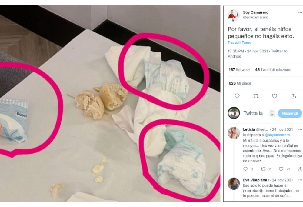 Il profilo “Soy Camarero” su Twitter è una pagina spagnola che raccoglie in maniera ironica e divertente alcuni aneddoti che riguardano il mondo della ristorazione, visto da chi serve ai tavoli. Uno degli ultimi post pubblicato da un cameriere più che far ridere, fa riflettere: racconta una storia che dimostra poco rispetto per chi lavora. Una coppia con figli molto piccoli, dopo aver cenato nel locale in cui il ragazzo autore del post lavora, ha lasciato i pannolini sporchi del figlio sul tavolo. Vi sembra una cosa ragionevole? Sicuramente esistevano dei cestini in bagno dove gettarli. il cameriere è lì per sparecchiare il tavolo da avanzi di cibo e dalle stoviglie usate, non per raccogliere gli escrementi di neonato che nel frattempo avranno “profumato l’ambiente”. Il cameriera invita tutti i genitori a non farlo, come se ce ne fosse bisogno!