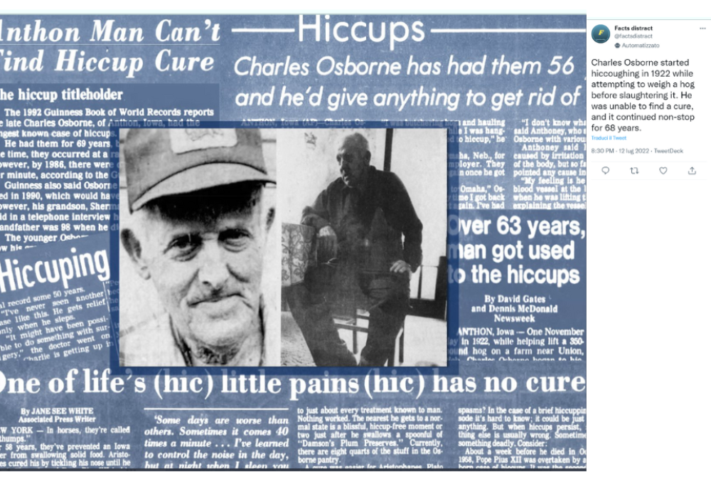 Charles Osborne nacque nel 1894 in Iowa, negli Stati Uniti. La sua vita era del tutto normale fino a che un giorno, trasportando un maiale verso il macello, cadde in terra. Quando si rialzò stava bene, ma inizio ad avere un singhiozzo che gli sarebbe durato per 68 anni!