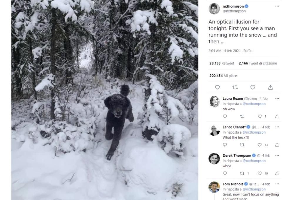 Sta circolando in rete l’ennesima illusione ottica in grado di far vacillare ogni certezza. In questa foto c’è chi è convinto di vedere un cane nella neve e chi giura e spergiura di vedere un uomo correre via di spalle, sempre nella neve, almeno questo.