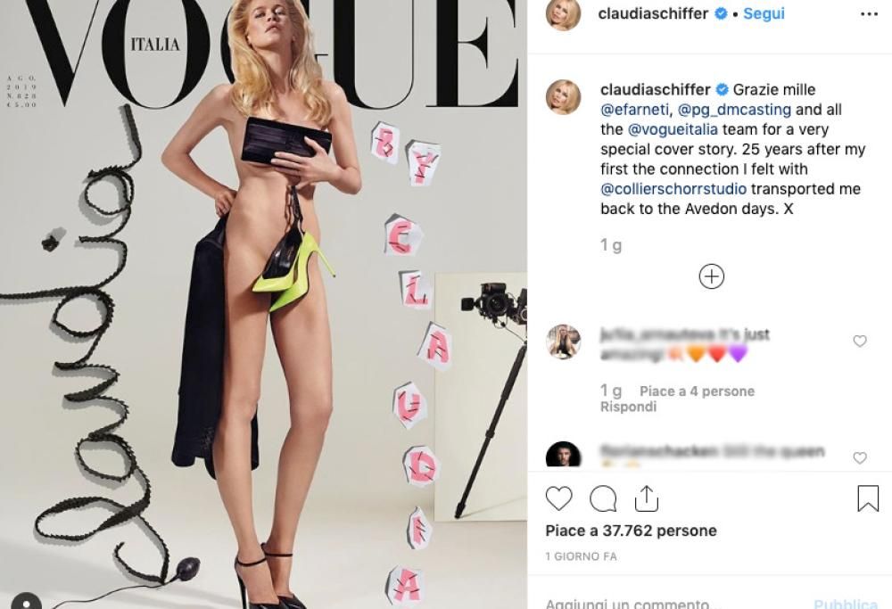 La Schiffer non ha perso il suo fascino e il suo fisico mozzato… a 48 anni sembra essere rimasta agli anni ’90. Tacchi a spillo, borsetta e scarpe che coprono le parti intime: Claudia appare così sulla cover di Vogue. E negli occhi quel suo modo unico di sedurre, ammaliante, disarmante. Le foto dello shooting fotografico sono state pubblicate dalla modella stessa su Instagram e hanno fatto in pochissimo tempo il pienone di like. Si tratta in realtà di un autoscatto, che Claudia ha fatto sotto la supervisione della fotografa Collier Schorr.