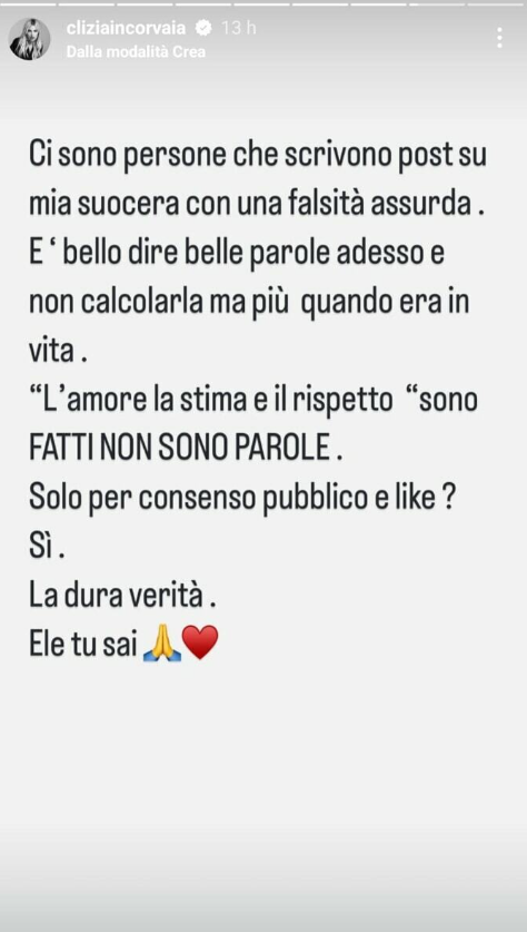 Nelle sue storie su Instagram, Clizia ha ringraziato chi ha mostrato affetto e vicinanza alla famiglia in questi mesi difficili, ma ha anche evidenziato l’incoerenza di alcune persone. “Ci sono persone che scrivono post su mia suocera di una falsità assurda”, ha scritto l’influencer, senza fare nomi diretti.