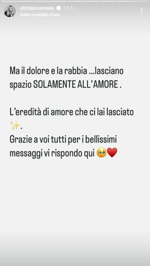 Dopo lo sfogo iniziale, Clizia ha voluto lasciare spazio alla gratitudine, ringraziando i follower e tutte le persone che hanno realmente sostenuto la sua famiglia. “Ma il dolore e la rabbia lasciano solamente spazio all’amore. Grazie a voi tutti per i bellissimi messaggi”, ha concluso.