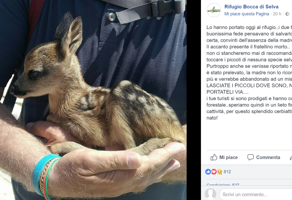 «Lo hanno portato oggi al rifugio..i due turisti in buonissima fede pensavano di salvarlo da morte certa, convinti dell’assenza della madre ed essendo lì accanto presente il fratellino morto.. non ci stancheremo mai di raccomandare di NON toccare i piccoli di nessuna specie selvatica!!! Purtroppo anche se venisse riportato nel luogo dove è stato prelevato, la madre non lo riconoscerebbe più e verrebbe abbandonato ad un misero destino… LASCIATE I PICCOLI DOVE SONO, NON PORTATELI VIA…. i due turisti si sono prodigati e hanno contatto la forestale.. speriamo quindi in un lieto fine anche se in cattività, per questo splendido cerbiattino appena nato!».