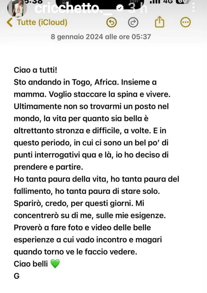 Ha infatti scritto: “Ciao a tutti! Sto andando in Togo, Africa. Insieme a mamma. Voglio staccare la spina e vivere. Ultimamente non so trovarmi un posto nel mondo, la vita per quanto sia bella è altrettanto str***a e difficile, a volte. E in questo periodo, in cui ci sono un bel po’ di punti interrogativi qua e là, io ho deciso di prendere e partire. Ho tanta paura della vita, ho tanta paura del fallimento, ho tanta paura di stare solo. Sparirò, credo, per questi giorni. Mi concentrerò su di me, sulle mie esigenze. Proverò a fare foto e video delle belle esperienze a cui vado incontro e magari quando torno ve le faccio vedere. Ciao belli”.