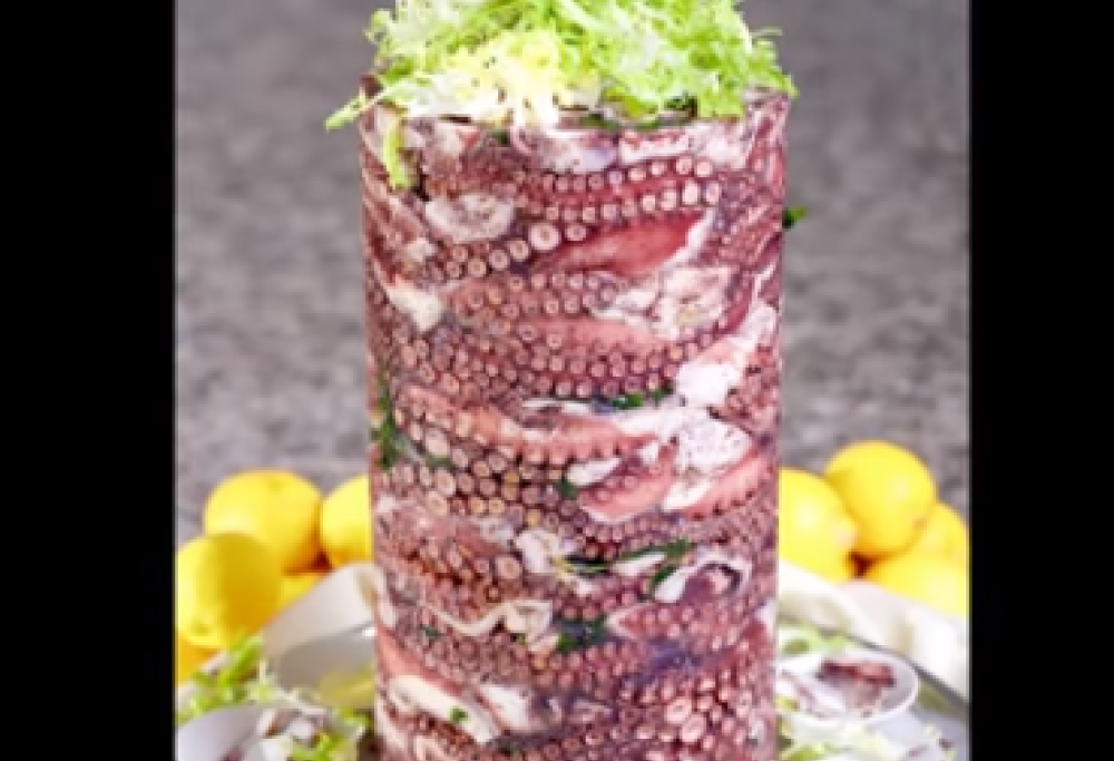 Non c’è molto da aggiungere, basta guardare le foto: il kepurp altro non è che insalata di polpo, pressata e impilata per apparire della stessa forma del piatto originale.