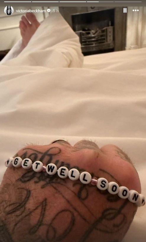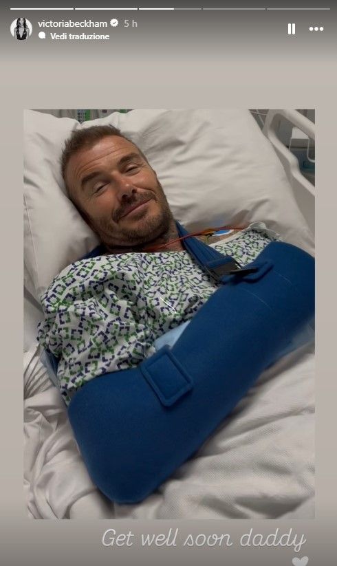 Nelle storie pubblicate, si vede Beckham a letto, con il braccio sinistro fasciato con un tutore blu. Nonostante l’evidente infortunio, il suo sorriso rimane rassicurante, segno della sua resilienza. Nell’altra foto pubblicata, stringe un braccialetto colorato con l’augurio “Get well soon“, simbolo di affetto e incoraggiamento. Nello sfondo, si intravede chiaramente il suo piede che spunta da sotto le coperte, un dettaglio che conferma senza ambiguità la sua permanenza in ospedale.