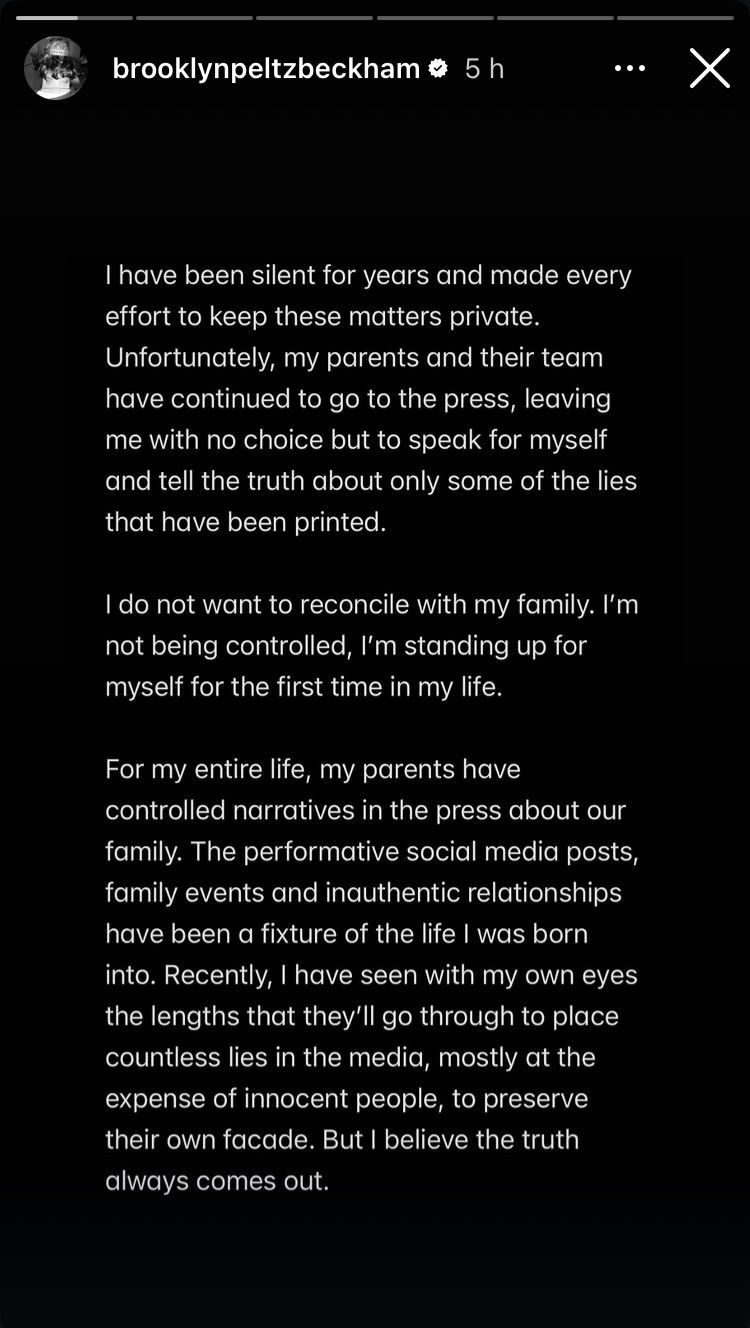 Brooklyn, 26 anni, ha utilizzato le sue Instagram stories per denunciare anni di controllo, pressioni e umiliazioni da parte dei genitori David e Victoria, accusandoli di anteporre la propria immagine pubblica al suo benessere personale. Secondo il primogenito, le tensioni sono esplose durante la preparazione del matrimonio con Nicola Peltz, con episodi imbarazzanti e interferenze nei dettagli della cerimonia, fino al primo ballo sul palco con sua madre invece che con la moglie.