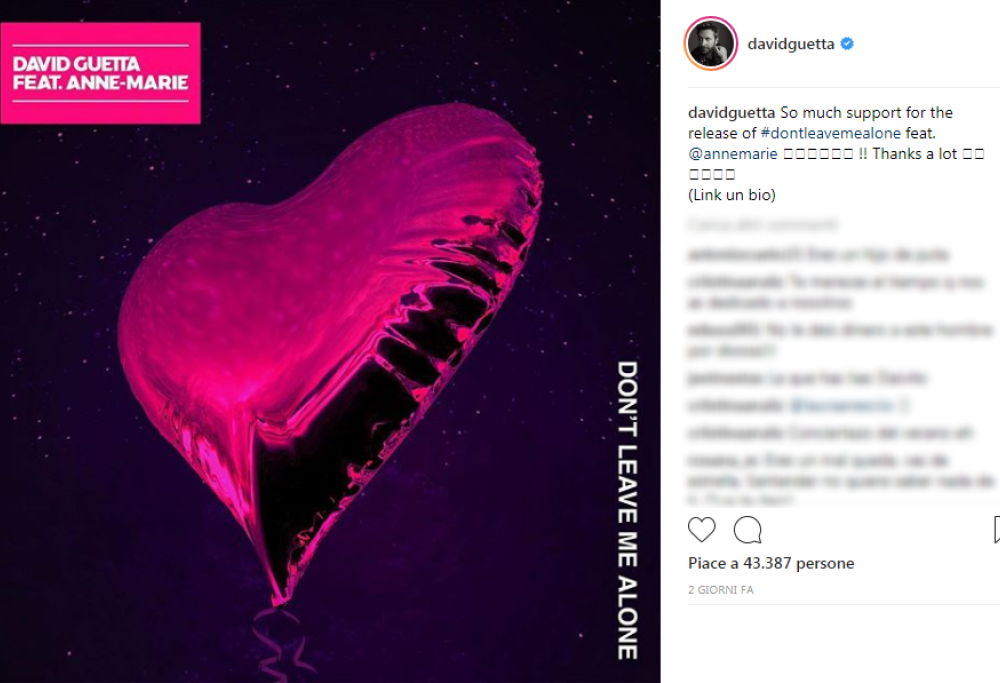David Guetta sta già dominando l’estate musicale con Flame, il suo singolo in coppia con la cantautrice australiana Sia. Ora è uscita anche una nuova canzone del Dj francese, con un altro featuring destinato a spaccare le classifiche. Il brano è Don’t Leave Me Alone, la voce è quella di Anne-Marie. Il nuovo singolo anticipa il prossimo album di David Guetta, che sarà il settimo della sua carriera e la cui uscita discografica non è stata ancora annunciata ma è prevista entro la fine del 2018.