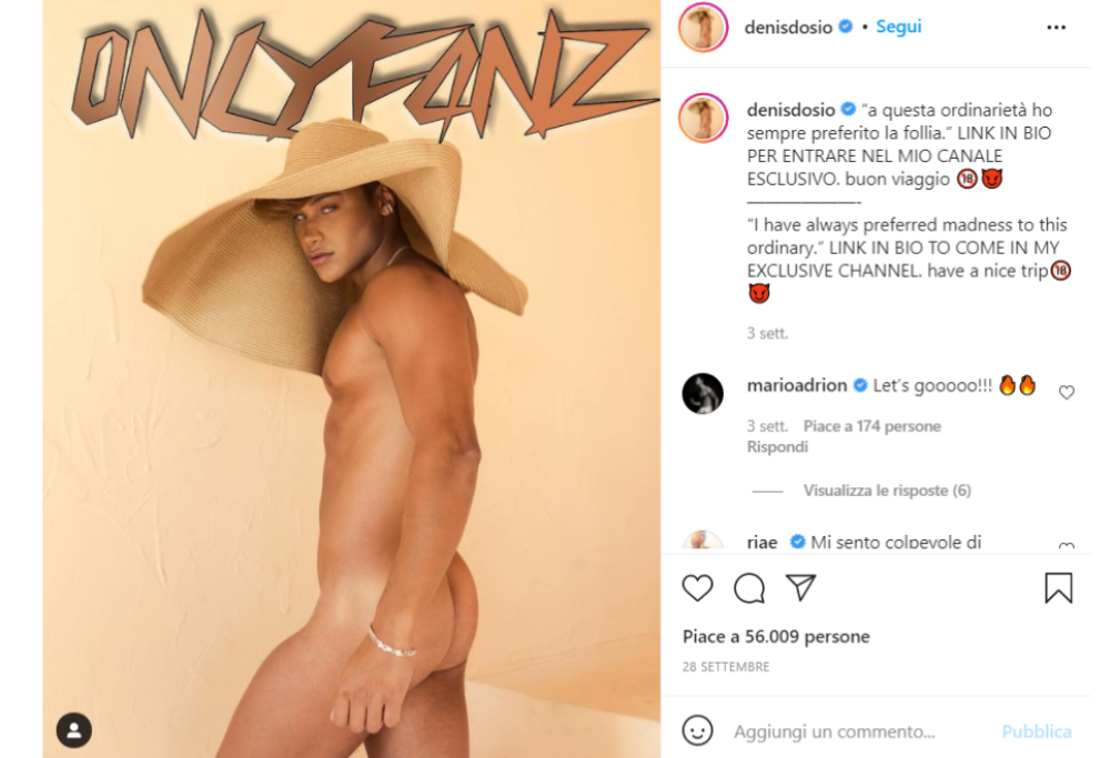 A fine settembre il giovane influencer Denis Dosio ha deciso di sbarcare su OnlyFans, una piattaforma su cui è possibile condividere contenuti a pagamento (generalmente hot) e chattare con i fan iscritto al canale a pagamento del vip da cui sono attratti. In un’intervista lasciata da Dosio a Vanity Fair sembra proprio che la mossa di usare OnlyFans si sia rivelata vincente con un boom di 1000 iscritti paganti in sole 24 ore: 15mila dollari, quindi, visto che l’abbonamento è fissato a 15 dollari. Per ottenere cosa? Foto intime del creator completamente nudo, ma anche la possibilità di interagire con lui; mentre su Instagram è impossibile per Dosio rispondere a tutti i fan.