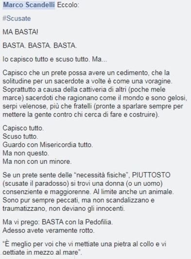 Dopo le numerose critiche che il suo messaggio gli ha attirato addosso, Don Scandelli è tornato sull’argomento: «Mi si fanno dire cose che io non ho minimamente pensato, distorcendo un paradosso (peraltro segnalato nel mio post) con il quale volevo far capire il mio disgusto assoluto per la pedofilia, oltreché per altre aberrazioni».