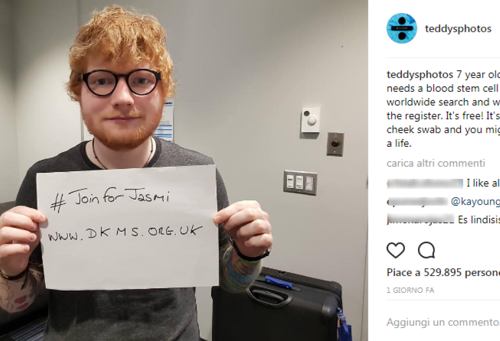 Sul social dedicato alle foto, infatti, Ed è attivo con regolarità ed entusiasmo, e, di recente ha anche usato il suo account per una buona causa: aiutare una bambina malata, bisognosa di un trapianto di cellule staminali del sangue. Il cantante si è fatto ritrarre con un cartello sul quale era scritto l’indirizzo del sito a cui registrarsi per diventare potenziali donatori ed aiutare la bambina. “La piccola Jasmi, ha scritto Ed, ha urgente bisogno di un donatore di cellule staminali del sangue: è una ricerca su scala mondiale, registratevi e salvate una vita“.