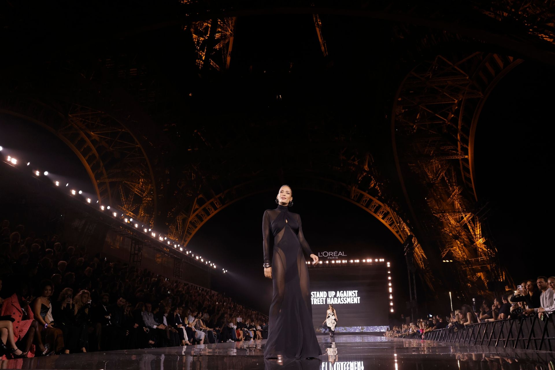 La sfilata si è svolta presso il Parvis De La Tour Eiffel e ha visto la partecipazione di altre ambasciatrici del marchio, tra cui Kendall Jenner, Camila Cabello, Elle Fanning, Eva Longoria, Andie MacDowell, Helen Mirren e l’italiana Miriam Leone.