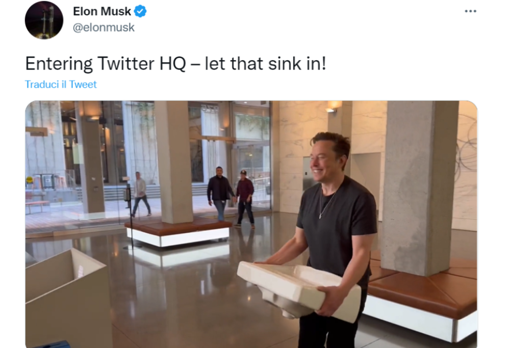 Elon Musk entra negli uffici di Twitter con un lavandino in mano