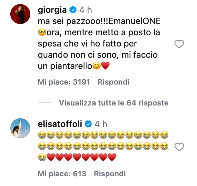 La reazione di Giorgia non si è fatta attendere, con un commento spontaneo e pieno di ironia che mostra tutta la sua commozione di fronte alle parole del compagno: “Ma sei pazzooo! Emanuelone ora, mentre metto a posto la spesa che vi ho fatto per quando non ci sono, mi faccio un piantarello”.