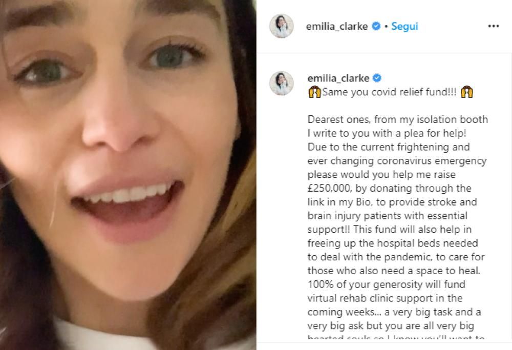 Solo poche ore fa Emilia Clarke ha infatti postato un appello sul suo profilo Instagram. Nel video messaggio registrato dove sta vivendo anche lei il suo periodo di isolamento, l’attrice britannica chiede ai suoi fan un piccolo aiuto.
