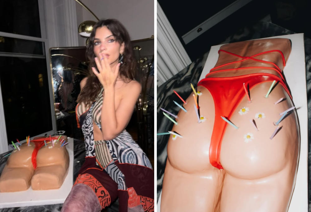 Per il suo 34º compleanno, Emily Ratajkowski ha deciso di mandare all’aria ogni convenzione e servire ai suoi invitati – letteralmente – un dolce che ha fatto il giro del web: una torta a forma di sedere, decorata con un tanga rosso e dettagli incredibilmente realistici. Il gesto ha suscitato commenti di ogni tipo, ma ha centrato in pieno l’obiettivo: far parlare (e molto).