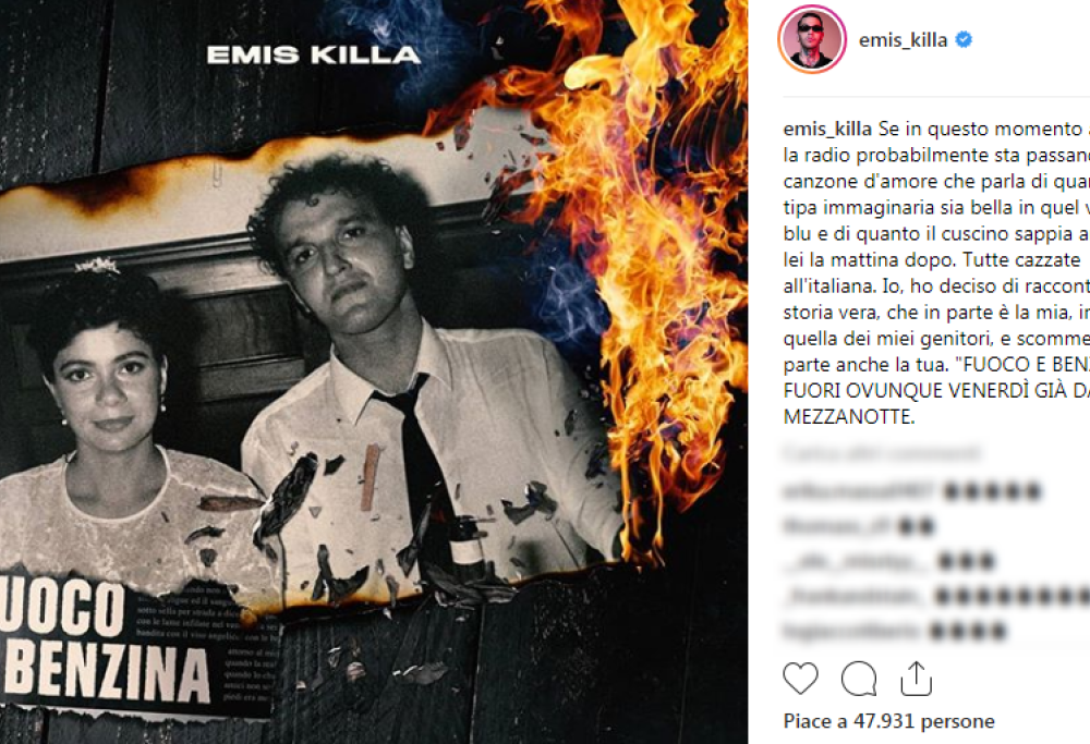 «Tutte cazzate all’italiana», appunto. Emis Killa è diverso, cerca la verità e lo fa nella storia della sua famiglia. È di questo che parla Fuoco e benzina. «Io, ho deciso di raccontarvi una storia vera, che in parte è la mia, in parte quella dei miei genitori, e scommetto in parte anche la tua». L’annuncio è stato corredato dalla copertina del singolo, sulla quale si vede una foto dei suoi genitori: Fuoco e Benzina arriva venerdì 5 ottobre, a mezzanotte, preparate gli estintori.