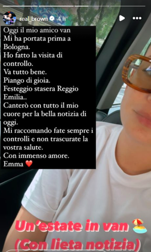 “Oggi il mio amico van mi ha portata prima a Bologna. Ho fatto la visita di controllo. Va tutto bene. Piango di gioia. Festeggio stasera a Reggio Emilia. Canterò con tutto il mio cuore per la bella notizia di oggi“, ha scritto. Senza dimenticare di invitare le sue numerose fan alla prevenzione: “Mi raccomando fate sempre i controlli e non trascurate la vostra salute. Con immenso amore”.