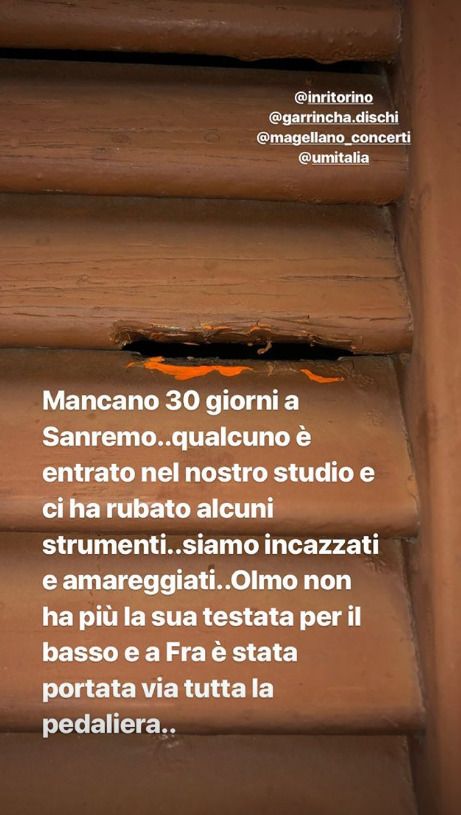 Dopo il caso che ha visto coinvolti i Negrita, c’è stato un altro furto di strumenti musicali ai danni di una band italiana: si tratta degli Ex-Otago. Tra un mese parteciperanno al prossimo Festival di Sanremo ma per ora si sono trovati senza strumentazione. Lo hanno fatto sapere direttamente loro attraverso le storie di Instagram: «Mancano 30 giorni a Sanremo… qualcuno è entrato nel nostro studio e ci ha rubato alcuni strumenti… siamo incazzati e amareggiati…».