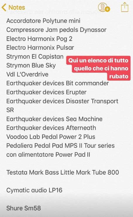 «Olmo non ha più la sua testata per il basso e a Fra è stata portata via tutta la pedaliera…», hanno fatto sapere, per poi pubblicare la (lunga) lista dei pezzi rubati. «Se vedete annunci strani fatecelo sapere», hanno poi scritto. Due chitarre dei Negrita sono state recentemente recuperate grazie allo spirito di osservazione di un negoziante di strumenti musicali di Perugia, ai quali i ladri avevano cercato di rivenderle.