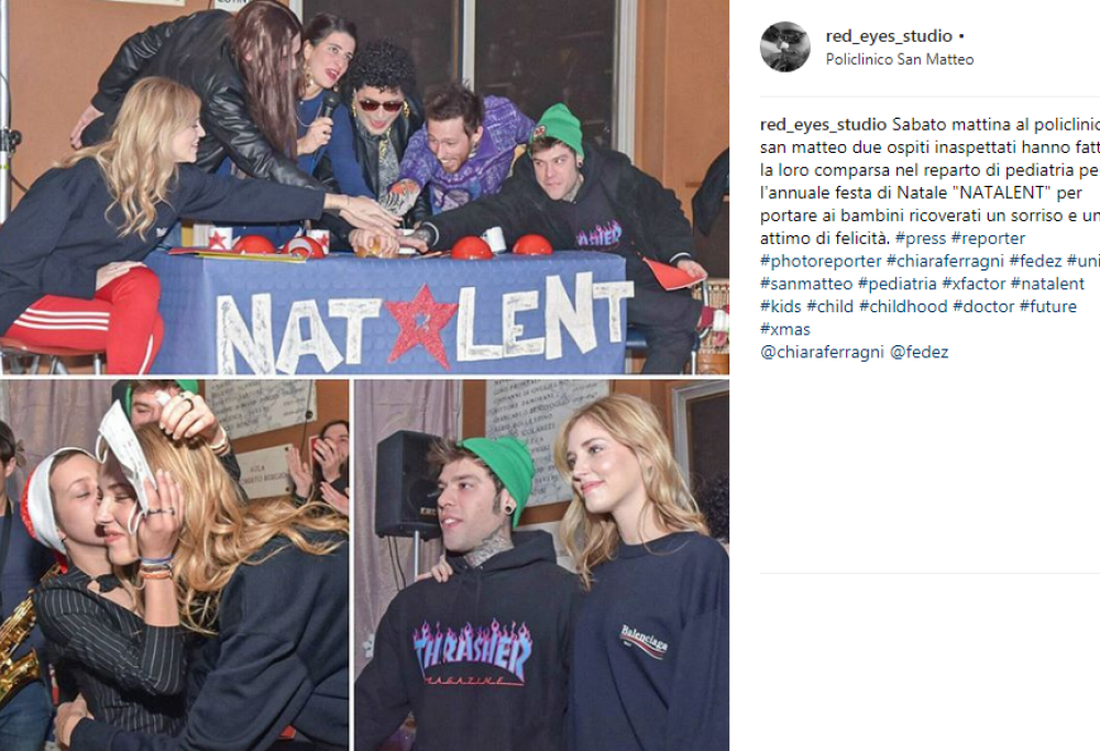 Non solo viaggi intercontinentali e vita mondana per Fedez e Chiara Ferragni. In occasione del Natale, il rapper e la fidanzata fashion-blogger hanno voluto fare un gesto molto carino, partecipando alla festa di Natale all’Ospedale San Matteo di Pavia dove hanno regalato un sorriso ai bambini ricoverati nel reparto Pediatria e Oncoematologia. Lo spettacolo, intitolato “Natalent: Pediatria’s got Talent” (un mix tra X Factor e Italia’s Got Talent), ha visto coinvolti tutti, dai piccoli pazienti al personale del reparto.