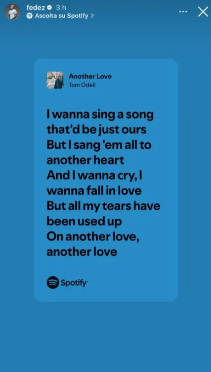 La recente separazione tra Fedez e Chiara Ferragni continua a far discutere in particolare per le emozioni che emergono dai gesti e dalle parole condivise dai due protagonisti. Dopo alcune riflessioni da parte di Chiara, ora è il tempo di Fedez di esternare il proprio stato d’animo attraverso i social, pubblicando una serie di stories cariche di malinconia e riflessione. Tra le sue condivisioni, risaltano i versi del brano Another Love di Tom Odell, che sembrano risuonare profondamente con la situazione vissuta. La citazione, in inglese, è stata seguita dalla traduzione italiana: “E canterò una canzone, che sarà solo nostra. Ma le ho cantate tutte a un altro cuore. E voglio piangere, voglio imparare ad amare, ma ho esaurito tutte le mie lacrime”.