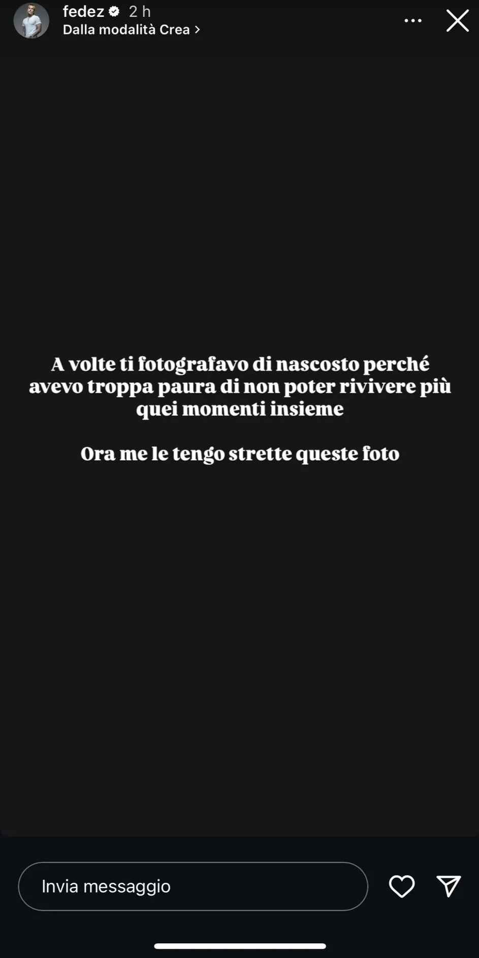 Queste parole sembrano riflettere un desiderio di ritrovare una connessione emotiva, mentre si fa strada il dolore di un amore perduto. Fedez ha inoltre aggiunto strofe che potrebbero far parte di un brano inedito, poi rapidamente rimosse, ma che rivelano un animo segnato dalla nostalgia. Tra queste, spicca una confessione intima: “A volte ti fotografavo di nascosto perché avevo troppa paura di non poter rivivere più quei momenti insieme. Ora me le tengo strette quelle foto”.
