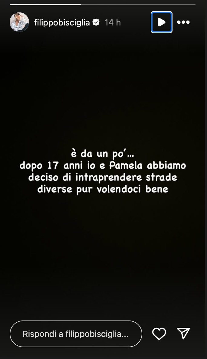 Dopo quasi due decenni insieme, Filippo Bisciglia e Pamela Camassa hanno ufficializzato la fine della loro relazione. La coppia, sempre molto riservata, ha scelto Instagram per condividere la notizia, pubblicando delle semplici storie con sfondo nero e scritte bianche in cui entrambi annunciano il loro addio.