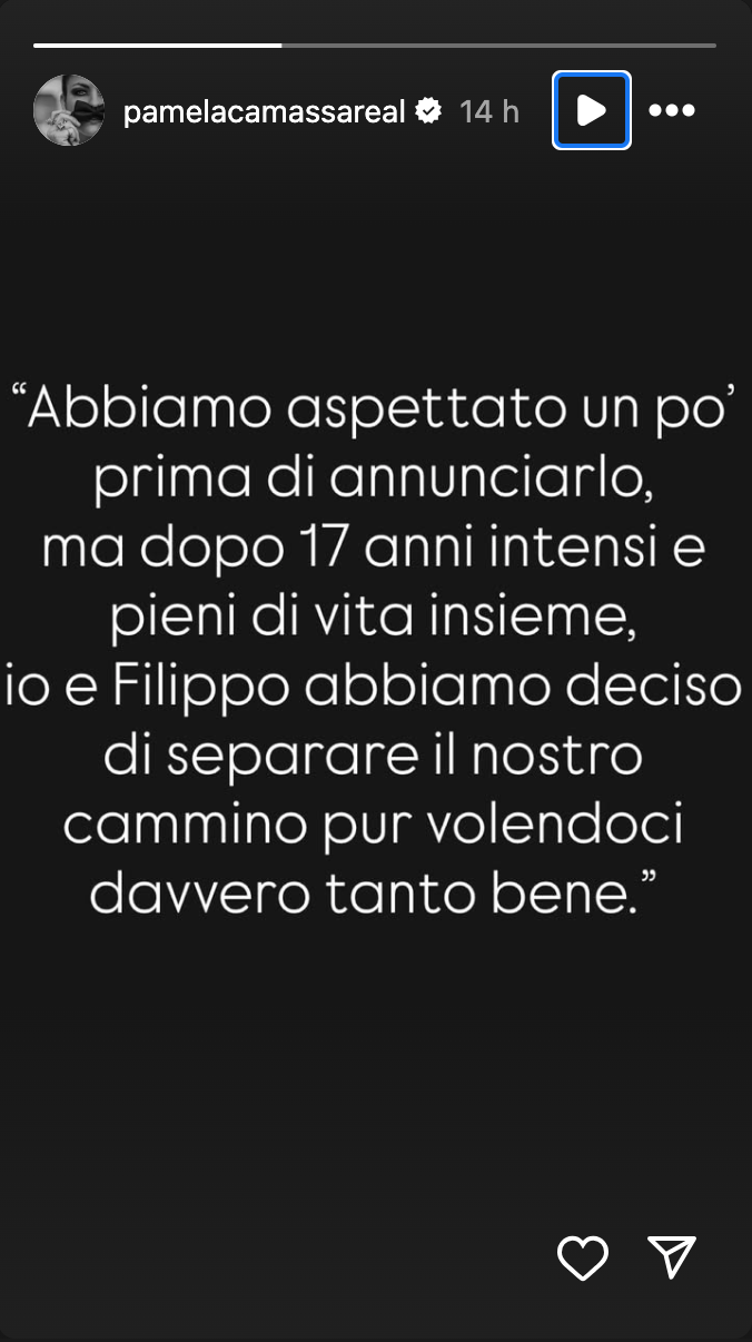 Anche Pamela Camassa, 41 anni, ha affidato ai social la sua versione, spiegando con delicatezza il momento che stanno vivendo: “Abbiamo aspettato un po’ prima di annunciarlo, ma dopo 17 anni intensi e pieni di vita insieme, io e Filippo abbiamo deciso di separare il nostro cammino pur volendoci davvero tanto bene”. Le parole dei due confermano che la rottura è stata consensuale e serena, senza rancori, ma con la consapevolezza che la storia d’amore fosse ormai arrivata al capolinea.