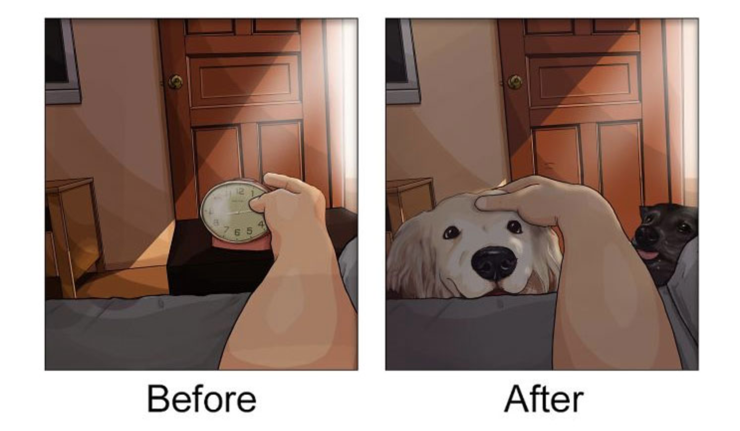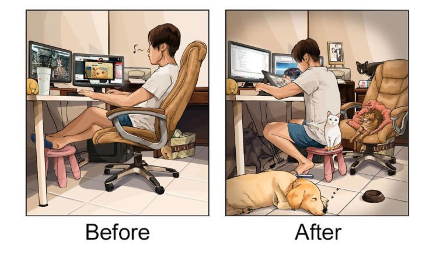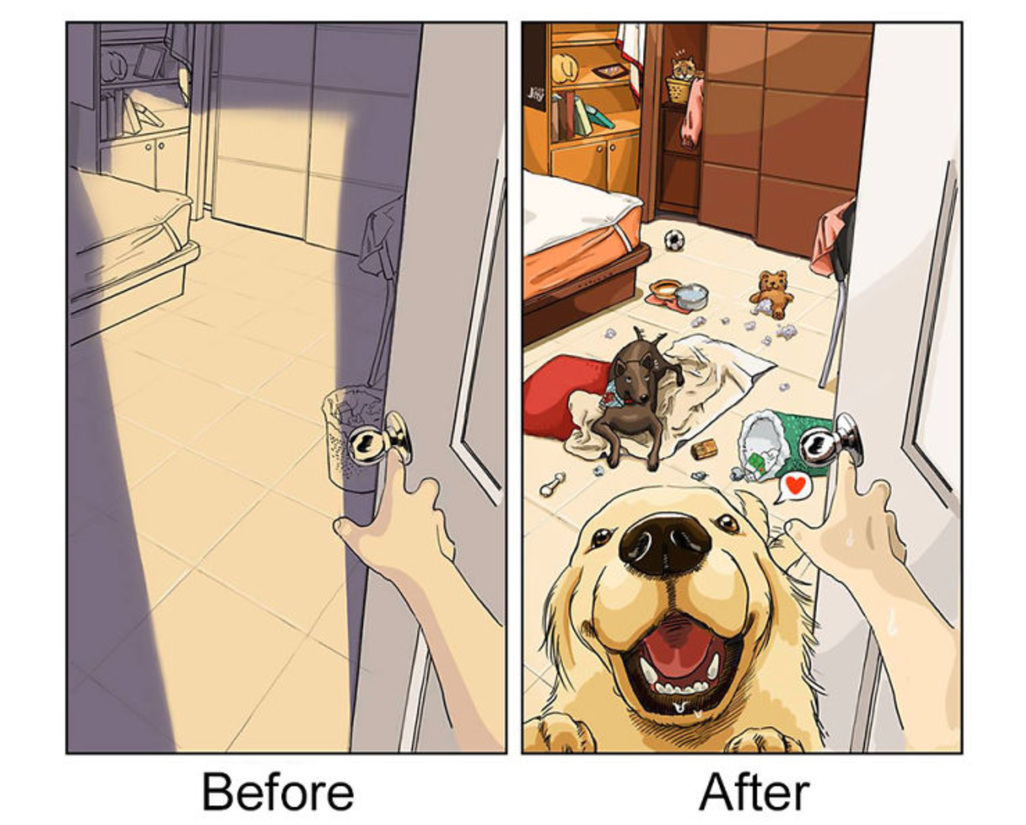 In ogni caso, è sempre bene prepararsi a questi piccoli grandi cambiamenti ed essere pronti ad affrontarli quando si decide di vivere con un amico a quattro zampe. Un artista che si fa chiamare John ha deciso di mostrare come cambia la vita con un animale domestico, realizzando delle illustrazioni davvero belle e significative: prendersi cura di un altro essere vivente è una grande responsabilità, ma se si è pronti a farsene carico si può vivere un’esperienza davvero unica. “Tutto ciò a cui penso quando finisco di lavorare – ha scritto John sulla sua pagina Facebook – è tornare a casa, sapendo che i miei cuccioli mi stanno aspettando. Mi fa sentire bene ed è una cosa dolcissima”.