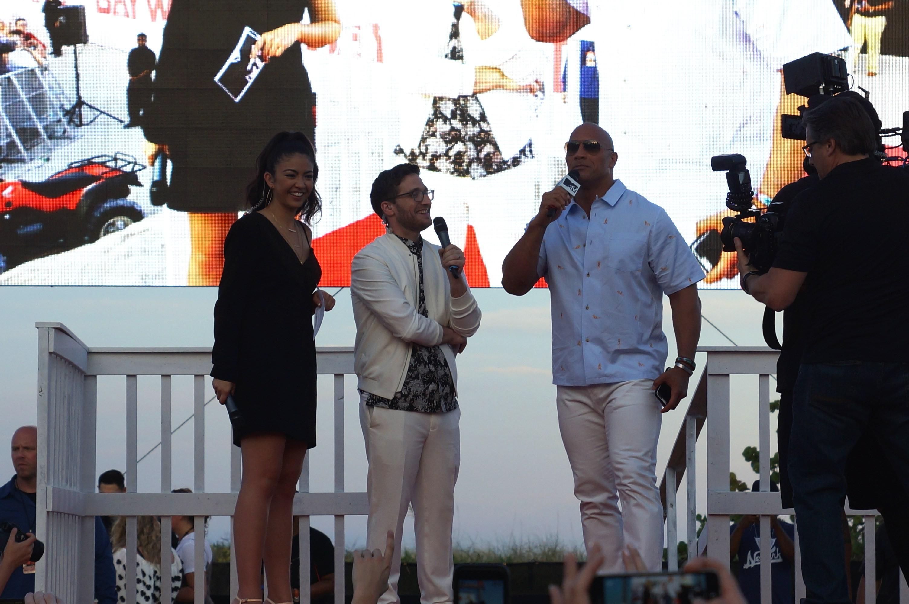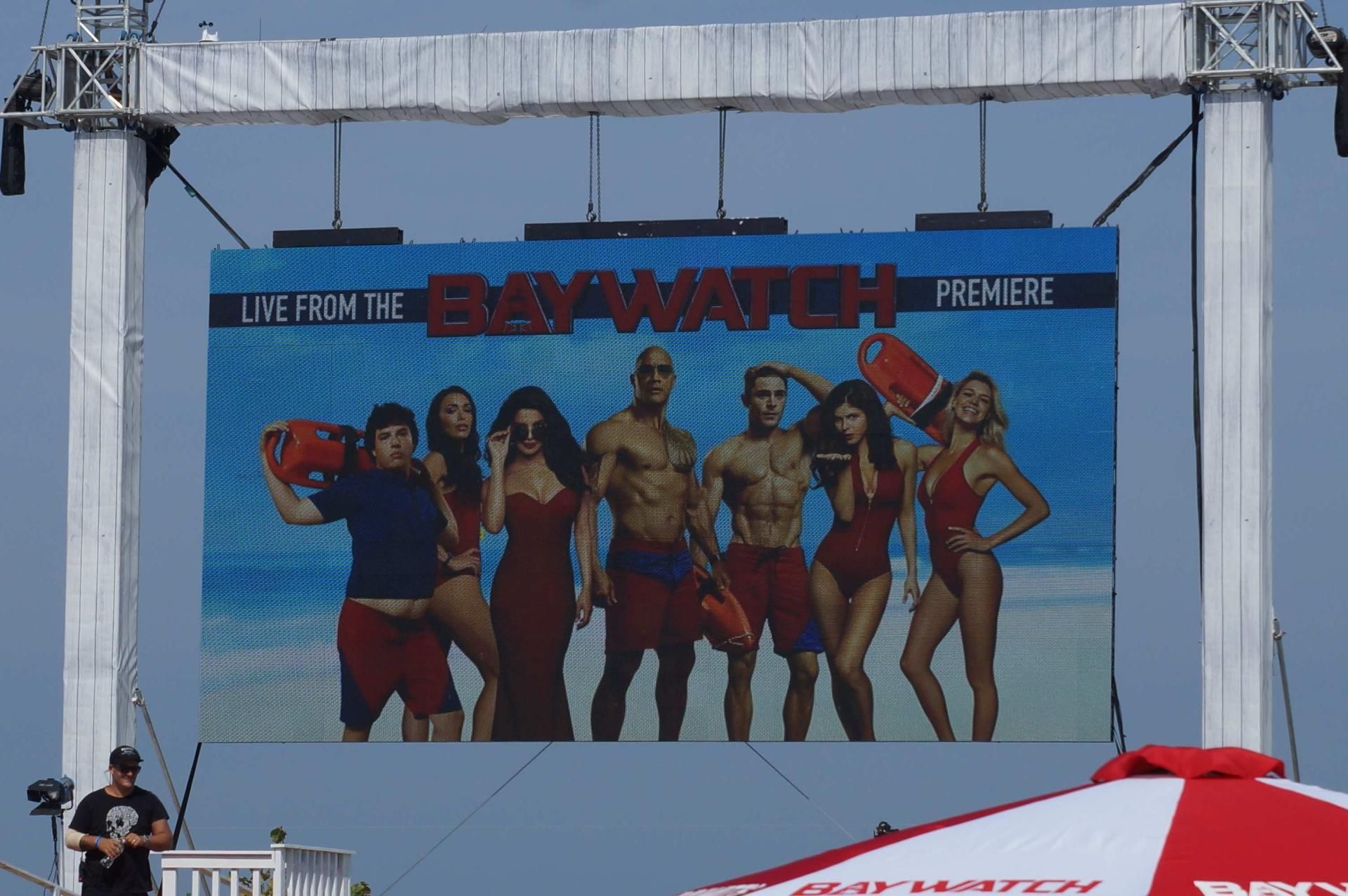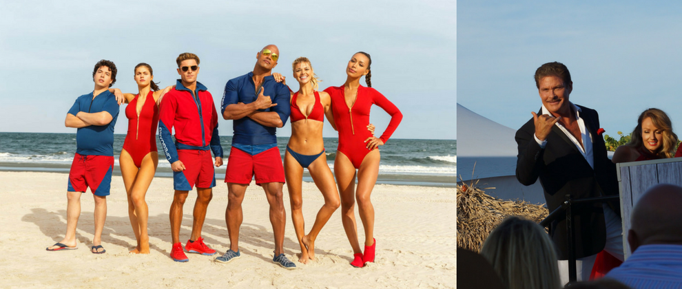 Ma, oltre ai nuovi protagonisti, erano presenti le due star del celebre telefilm: Pamela Anderson, tornata sulle prime pagine dei magazine per la sua relazione con il fondatore di Wikileaks Julian Assange, e David Hasselhoff, il mitico capo dei bagnini Mitch Buchannon. A raccogliere l’eredità di quest’ultimo è stato Dwayne “The Rock” Johnson, che nel film si ritroverà ad accogliere una giovane recluta interpretata da Zac Efron. Il cast è completato da Priyanka Chopra, Alexandra Daddario e Ilfenesh Hadera.