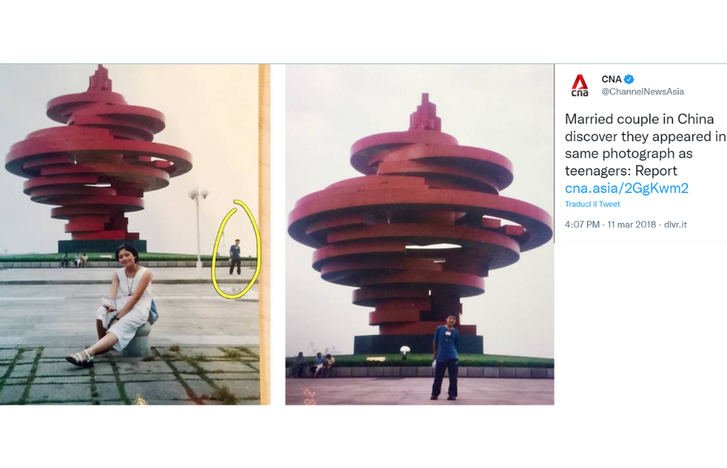 - Ad esempio è capitato a una coppia di sposi cinese di aver scoperto di avere una foto insieme, risalente a prima del loro incontro. Insomma il destino stava già provando a farli incontrare e alla fine ce l’ha fatta!